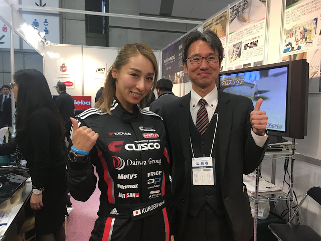 今年の国際オートアフターマーケットEXPOにも、新城ラリー直前なのに、わざわざレーシングスーツを着てアスナルブースにあいさつに来てくれました。 彼女のレーシングスーツには、仲間の会社マークが沢山あります。 これも彼女の人徳なのですねー!
